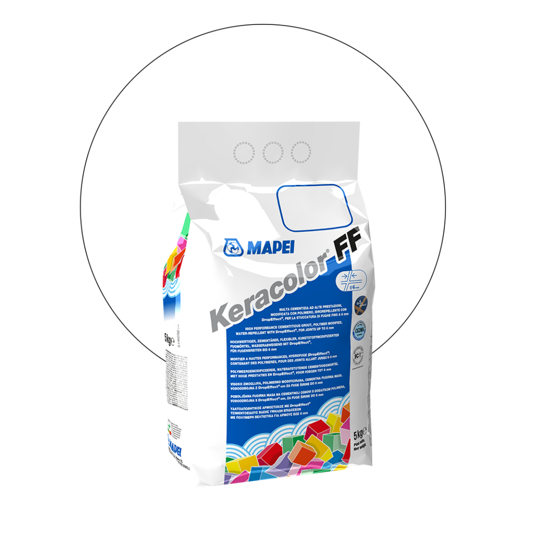 KERACOLOR FF de MAPEI est un Mortier de jointoiement à haute résistance, modifié par des polymères, hydrofugé avec DropEffect®, pour la réalisation de joints allant jusqu’à 6 mm de largeur.